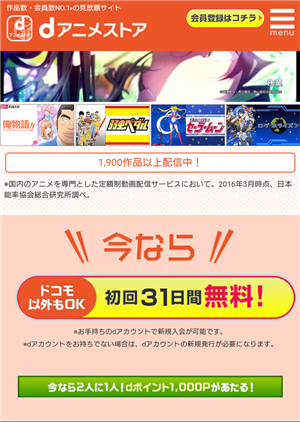 もちろん「dアニメストア」でも、初回登録の31日間は無料で利用する事ができます。