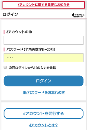 今回は「dアカウント」を持っているので、そのままIDとパスワードを入力します。