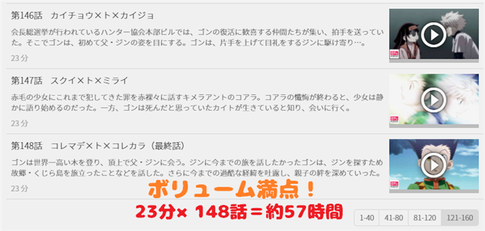 「HUNTER×HUNTER」のアニメは全128話と大変ボリューミーな作品となっていますので、無料期間内に見終らない時は、両方を順に使ってみるのもアリですよ。